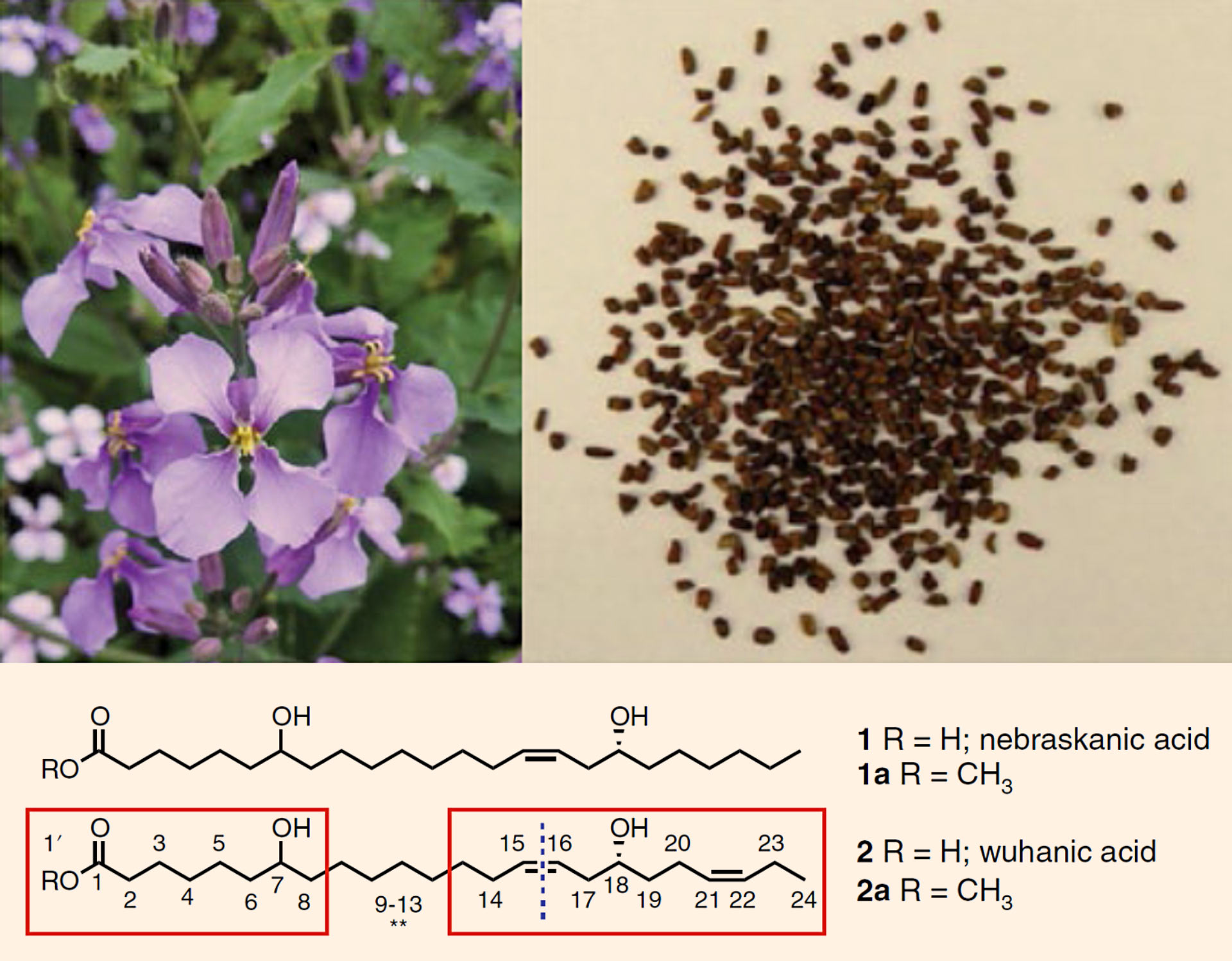 بالا: گل و تخم گیاه بنفشه چینی (Orychophragmus violaceus). پایین: ساختارهای اسیدهای چرب تک و غیر اشباع نشده نبراسکانیک (1) و ووهانیک (2). بخش های متیل ووهانات (2a) با رزونانس 13C و 1H به طور کامل با کادر های قرمز و کربن های شماره دار مشخص شده است. اعتبار تصویر: Li et al، doi: 10.1038 / s41477-018-0225-7